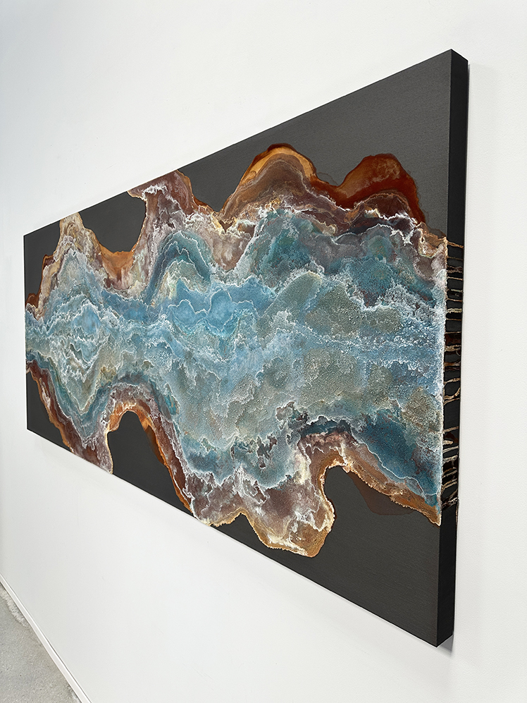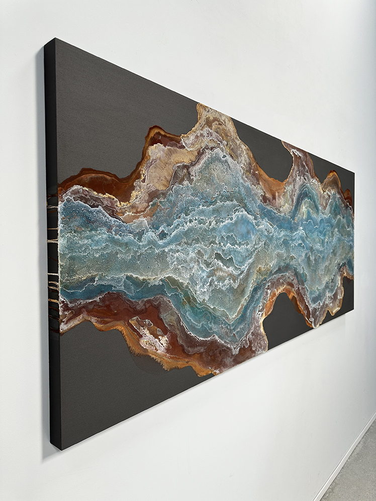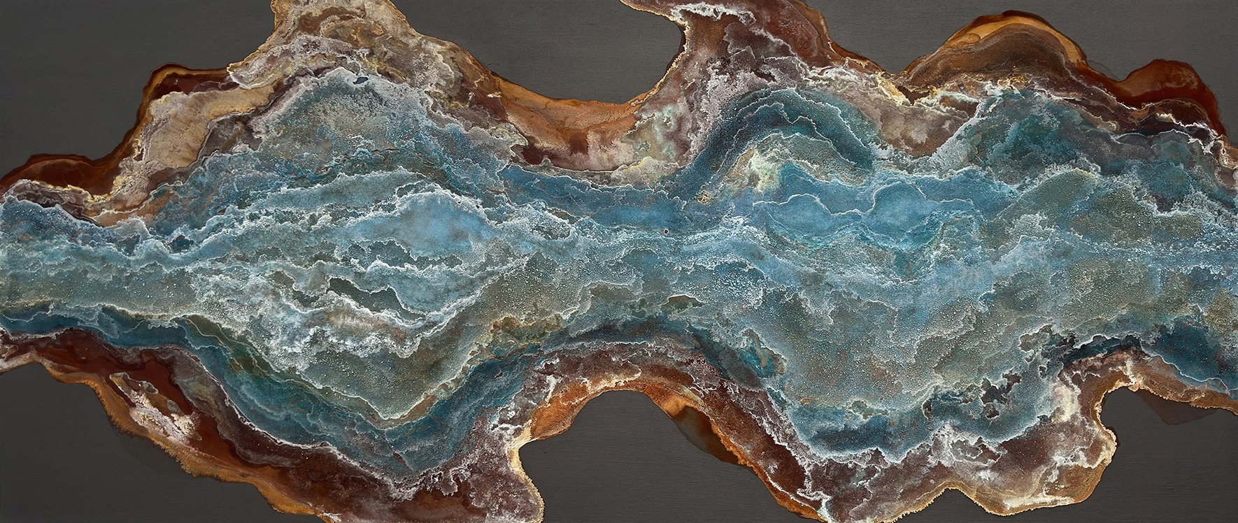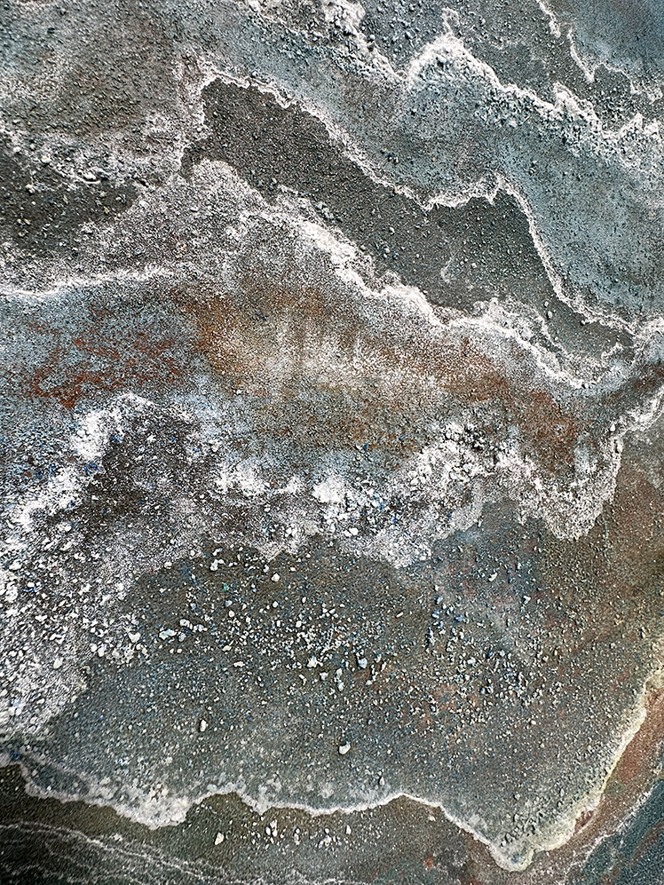 Tideflow, Amboy salt, water, fire, mineral on panel, 36x84," 2026
