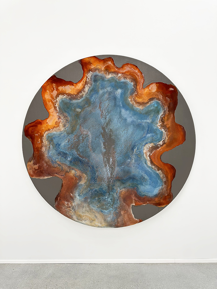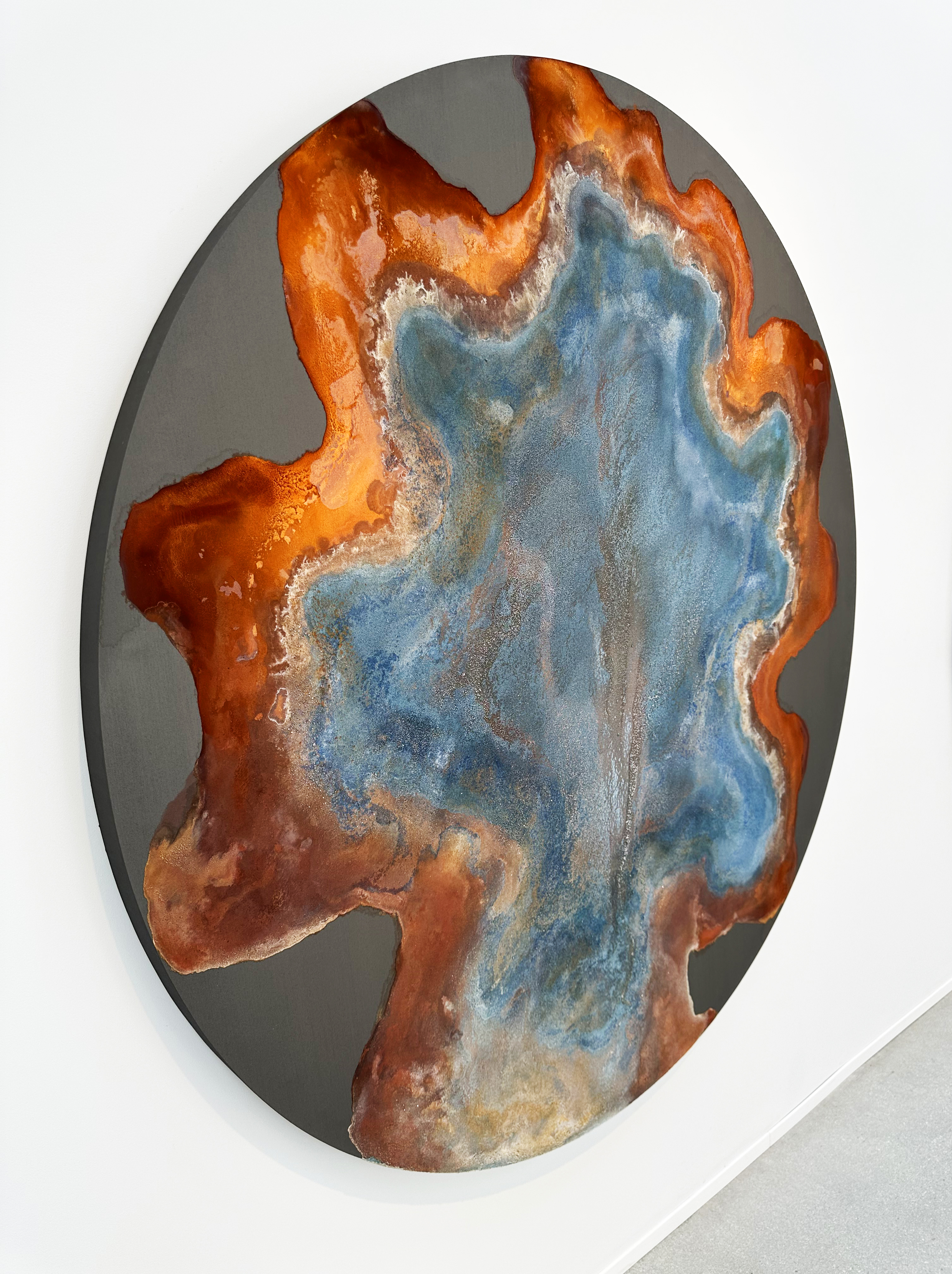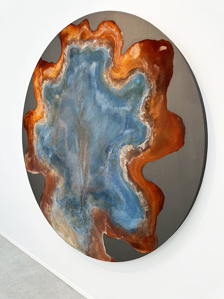 , Yellowstone geothermal water, salt, fire, mineral on panel, 72d," 2023